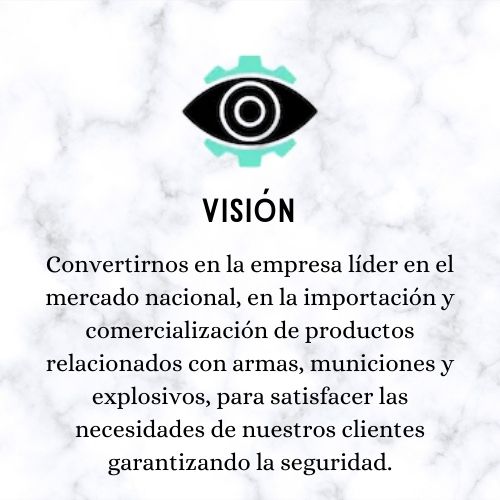 Es una empresa líder en el sector de importaciones, comercio y distribución de armas, municiones y explosivos, con más de 28 años de experiencia y servicio, brindando soluciones integrales y satisfaciendo adecuada y oportunamente las necesidades y expectativas de nuestros clientes. Contamos con toda la infraestructura, logística y personal capacitado, con productos y servicios que cumplen estándares nacionales e internacionales de calidad, estableciendo relaciones duraderas basadas en la confianza y a través de un equipo humano altamente calificado, motivado y comprometido.